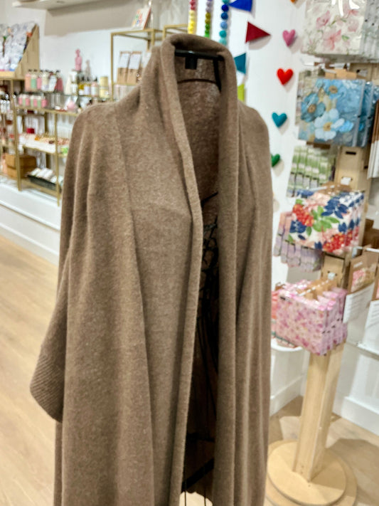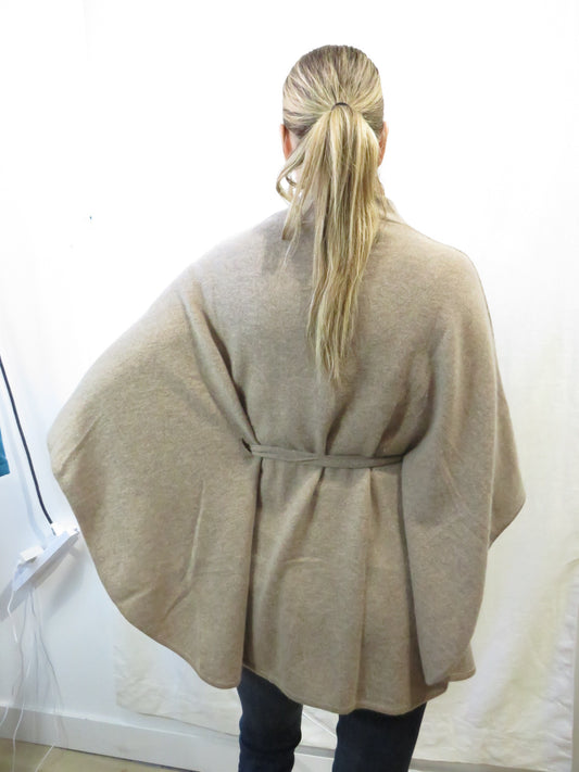 Pure Cashmere Belted Dark Beige Poncho - Wrap