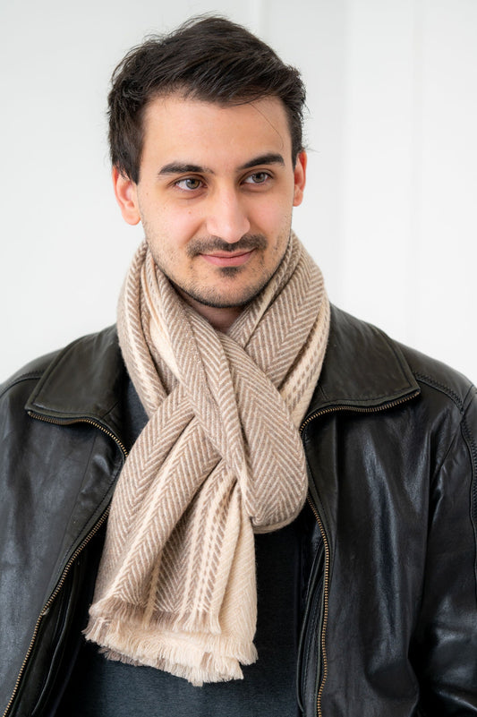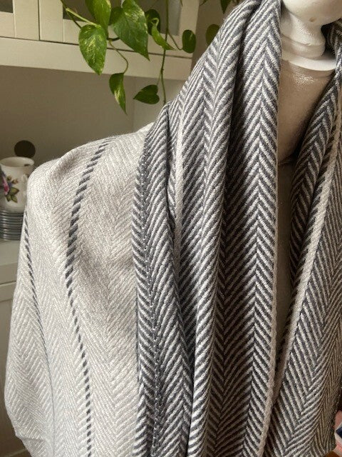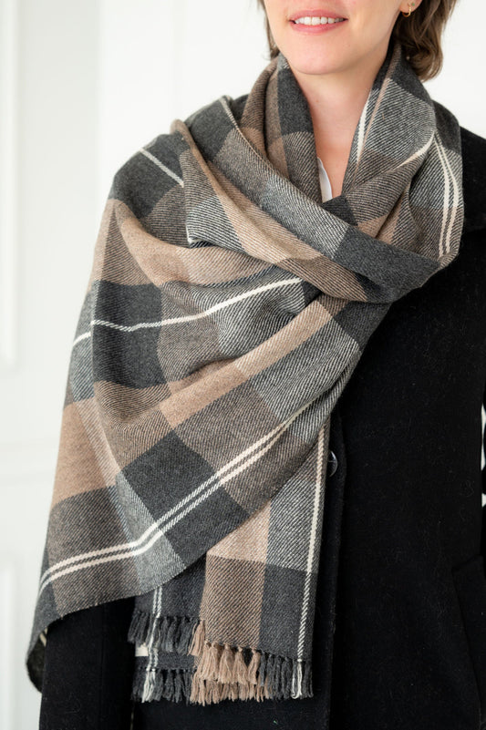 Thick and Plush Pure Cashmere Tartan Taupe and Grey Scarf