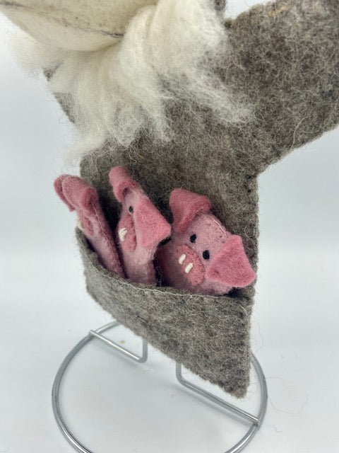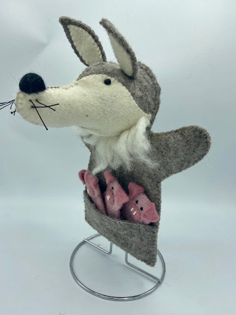 This adorable Big Bad Wolf hand puppet (with 3 little pig finger puppets) was crafted using traditional Nepalese felt. Ideal for story time, or as the perfect tool to engage in imaginative and interactive play with your child or toddler. Also, great for use over zoom to share smiles and laughter with grandchildren! Sturdy and thick the felt will endure for years and will become softer and more malleable with continued use.