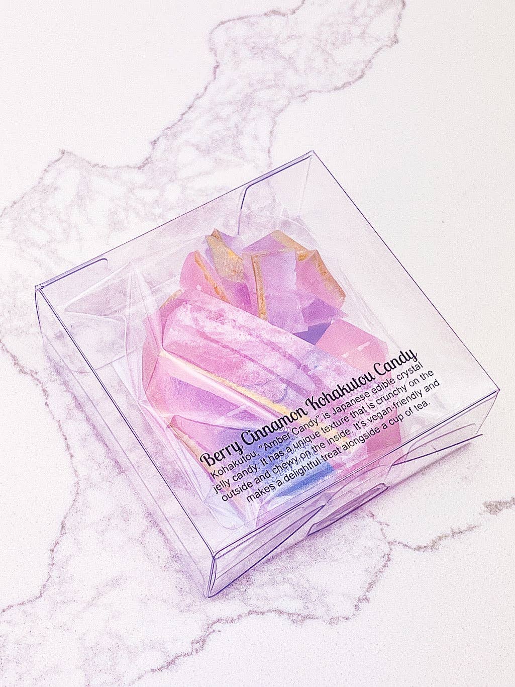Kohakutou, "Amber Candy" is Japanese edible crystal jelly candy. It has a unique texture that is crunchy on the outside and chewy on the inside. It's vegan-friendly and made of agar agar instead of gelatine. It makes a delightful treat alongside a cup of tea. The Berry Rose flavoured Kohakutou package contains 5-7 pieces/55g of Kohakutou.