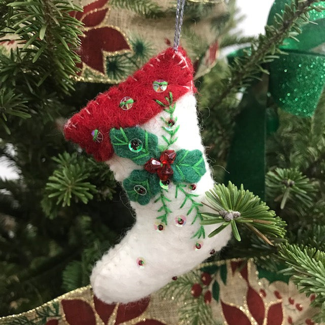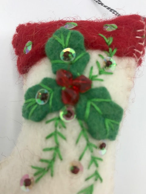 This beautiful felt stocking is one of our bestsellers! Classic white and red felt was crafted using traditional Nepalese felt. Overlaid with hand embroidered green holly and bead work.
