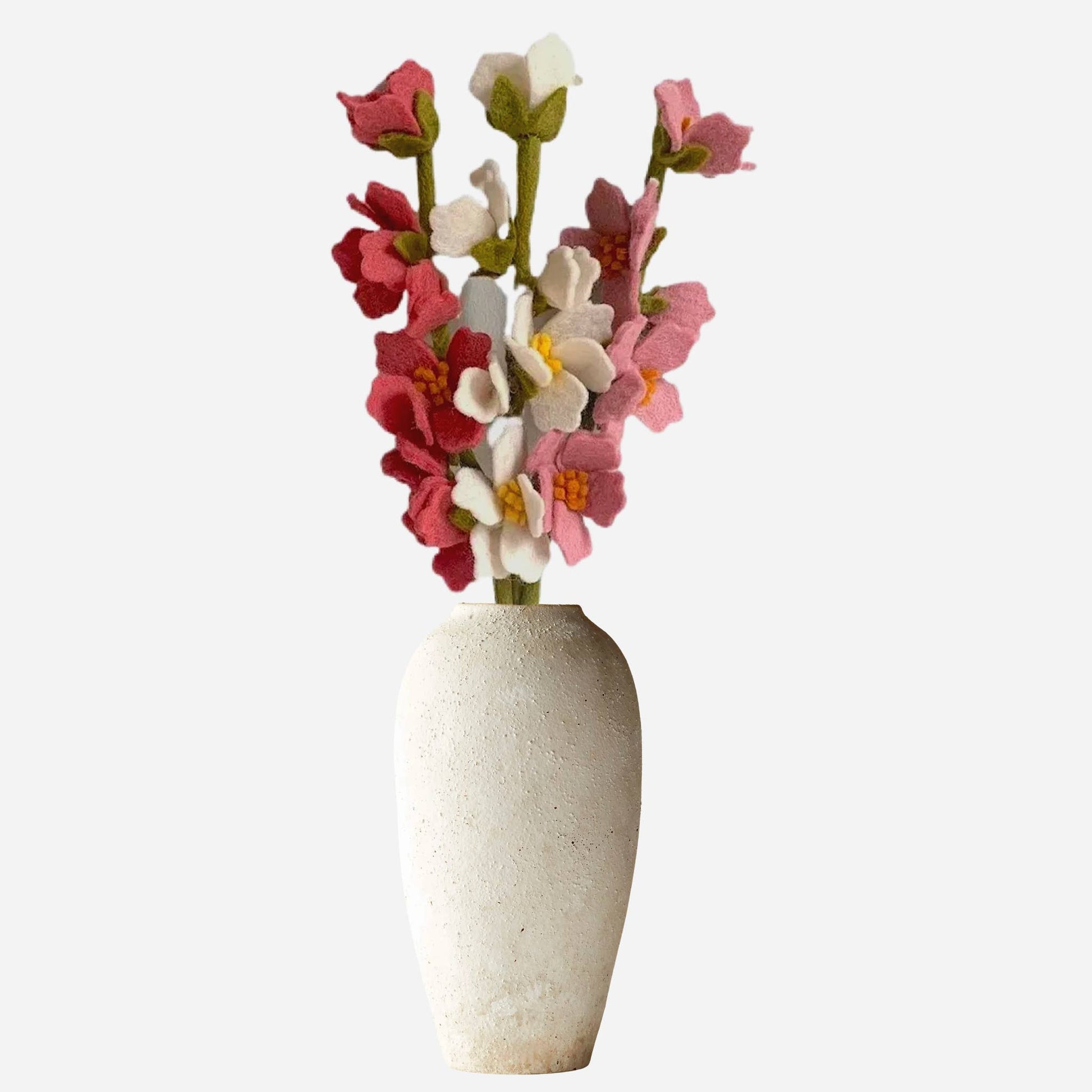 Celebrate spring with these perfect cherry blossom stems. Available in dusty pink, white and light pink. With a bendable wire stem, these flowers can be styled in their own vase or bunched together with green leaves. Each flower is dyed, cut, and stitched by hand in Nepal.Felted Wool, Azo-free, eco-friendly, non-toxic,4”W x 18”H