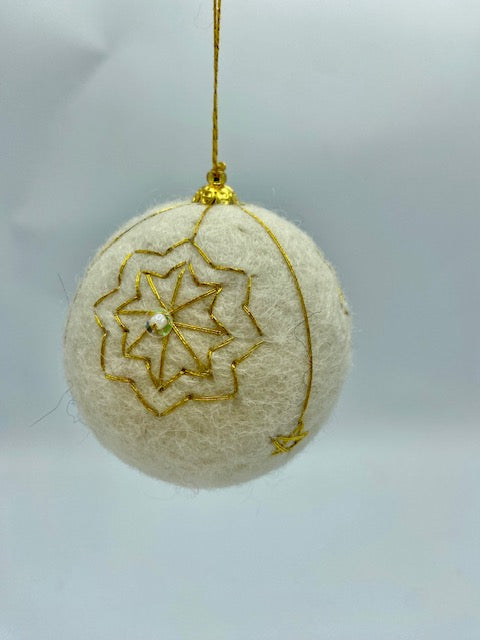 This classic white wool ball has a felt center overlaid with delicate gold hand embroidery.