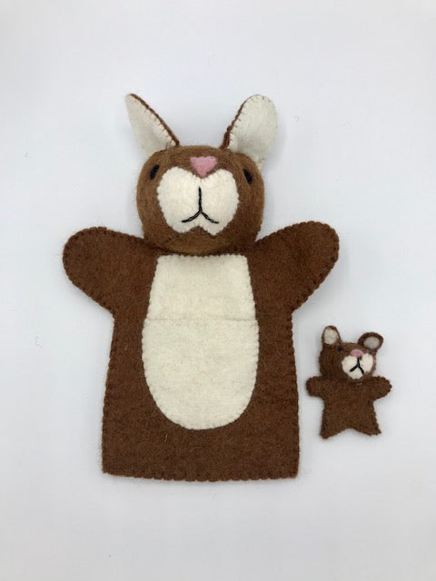 This adorable Mama Kangaroo hand puppet was crafted using traditional Nepalese felt. Ideal for story time, or as the perfect tool to engage in imaginative and interactive play with your child or toddler. Sturdy and thick the felt will endure for years and will become softer and more malleable with continued use. This set includes a free baby kangaroo finger puppet!