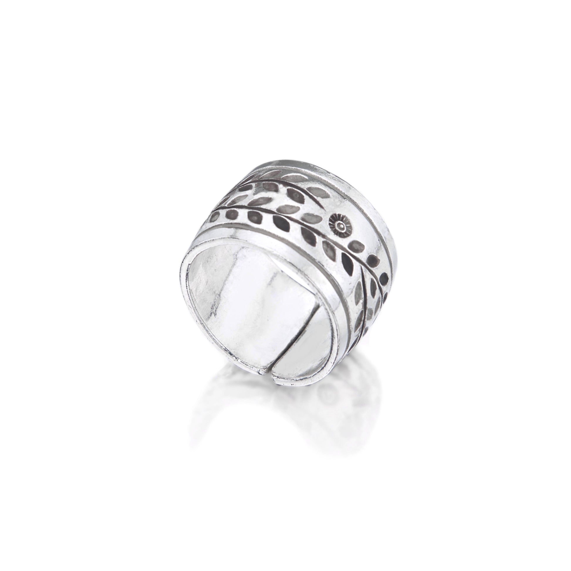 Our Leaf & Branch Ring is stamped with tiny leaves, branches and flower blossom designs and then oxidized to enhance its details. The flower blossoms represent blessings. All of our rings are made from non-allergenic nickel-free fine silver.