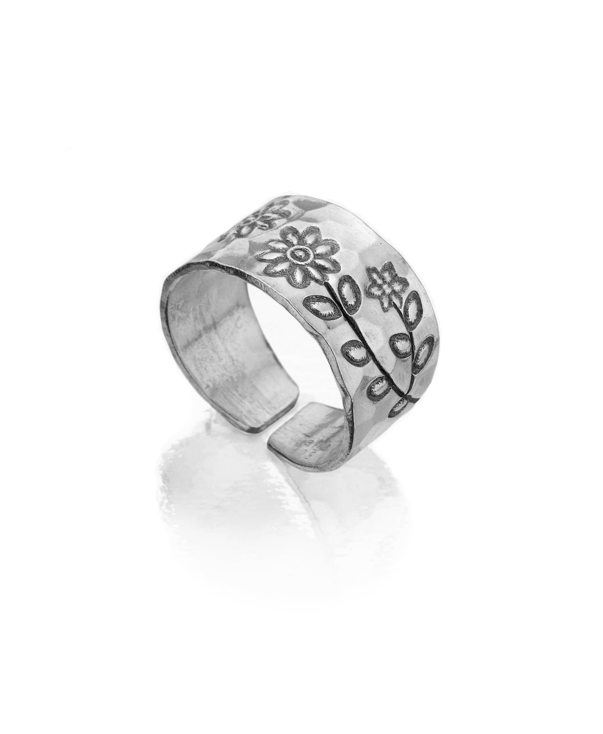 Our Flower Light Ring is stamped with flowers and is bright hammered silver that dances with light reflections. All of our rings are made from non-allergenic nickel-free fine silver, so people with sensitivities will be comfortable wearing them.