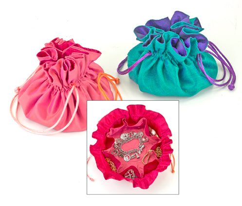 Our silk jewellery pouch has 8 pockets for your precious items. The centre has enough depth for a wide cuff. It is easy to open and close with a drawstring.