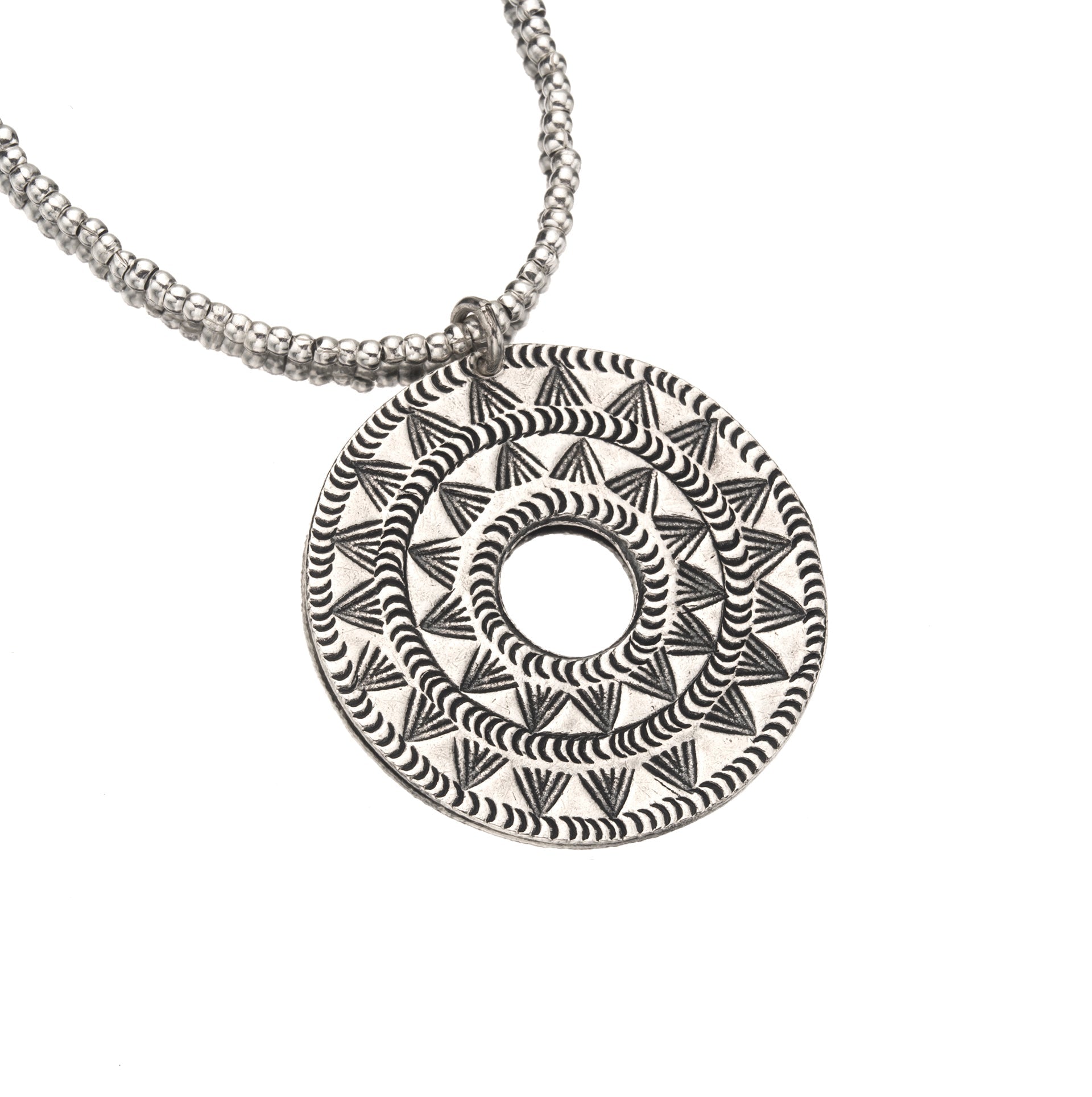 Our fine silver Tribal Sun Pendant is stamped with traditional designs and oxidized to enhance the details. The pendant is strung in Canada on a bright silver beaded necklace.