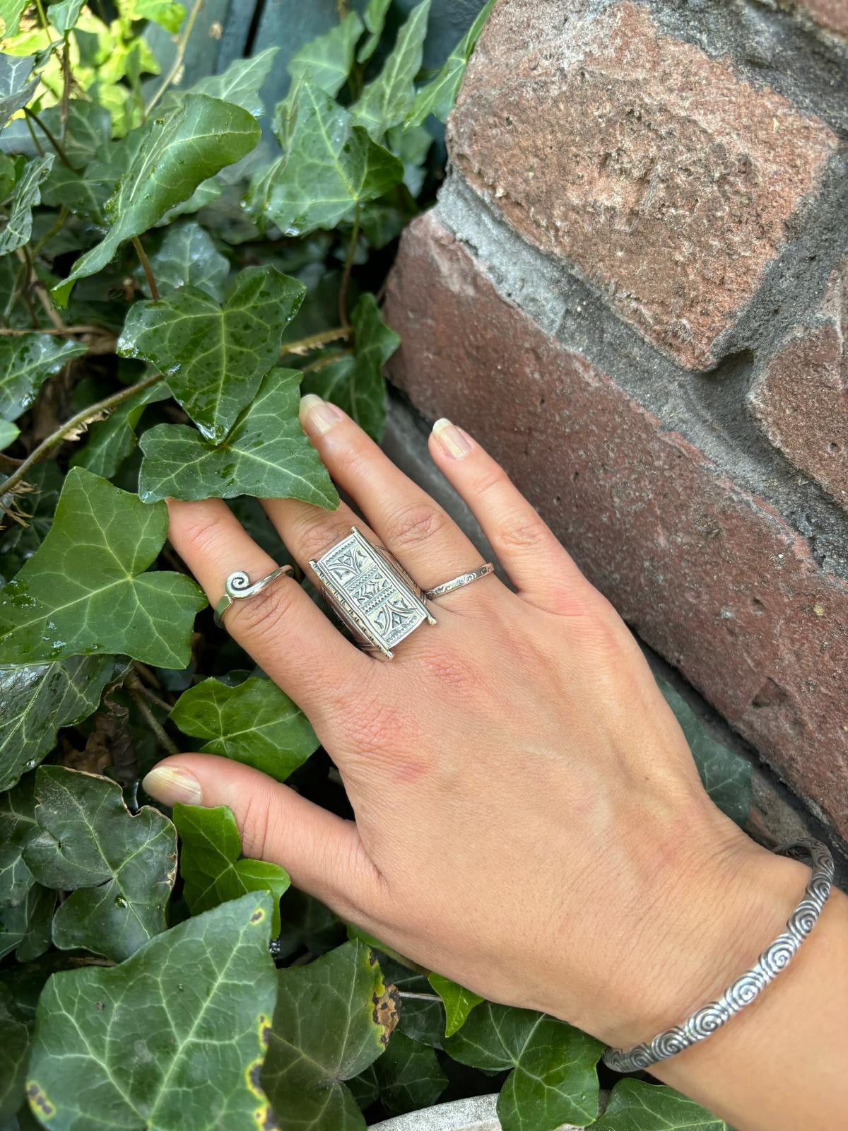 Our Swirling Edge Ring is stamped with traditional Karen hill tribe designs and oxidized to enhance the details. All of our rings are made from non-allergenic nickel-free fine silver.