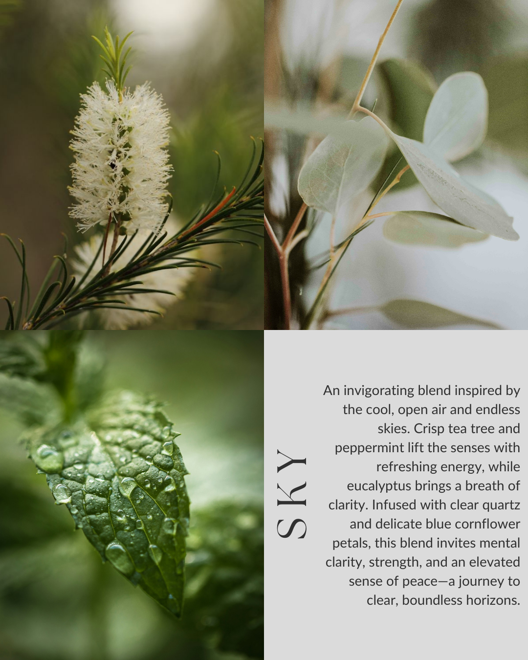 SKY An invigorating blend inspired by the cool, open air and endless skies. Crisp tea tree and peppermint lift the senses with refreshing energy, while eucalyptus brings a breath of clarity. Triple-washed & inspected natural gemstones.