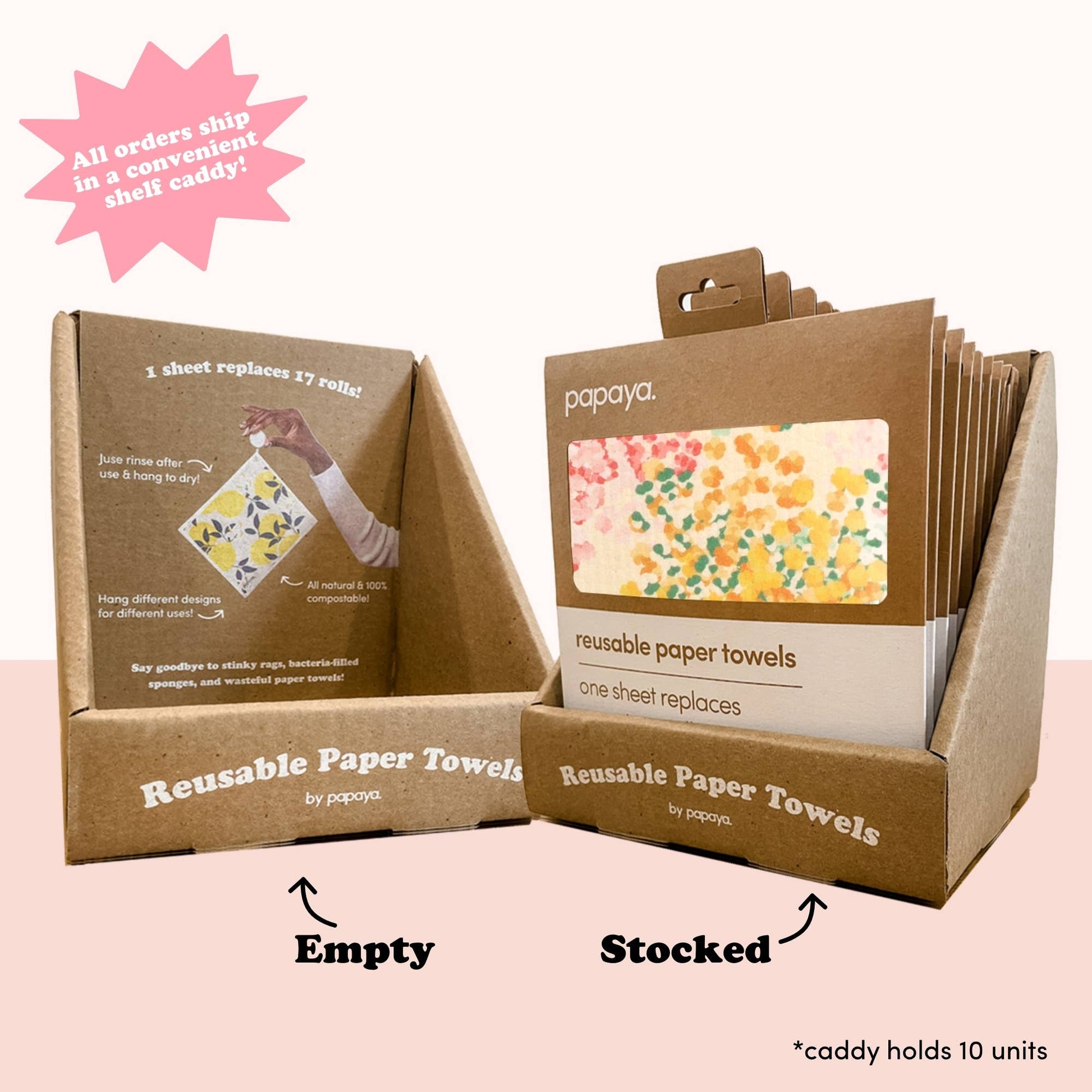 Each unit = 2 reusable paper towels + 1 hanging hook - All Natural & 100% Compostable! - Use on spills, appliances, messy toddlers, bathrooms and more! Papaya Packaging: - Peek-a-boo window to showcase the material & design - J-hook for easy hanging - Data backed messaging for a product that will fly off your shelves! - Each case ships in a convenient shelf caddy!