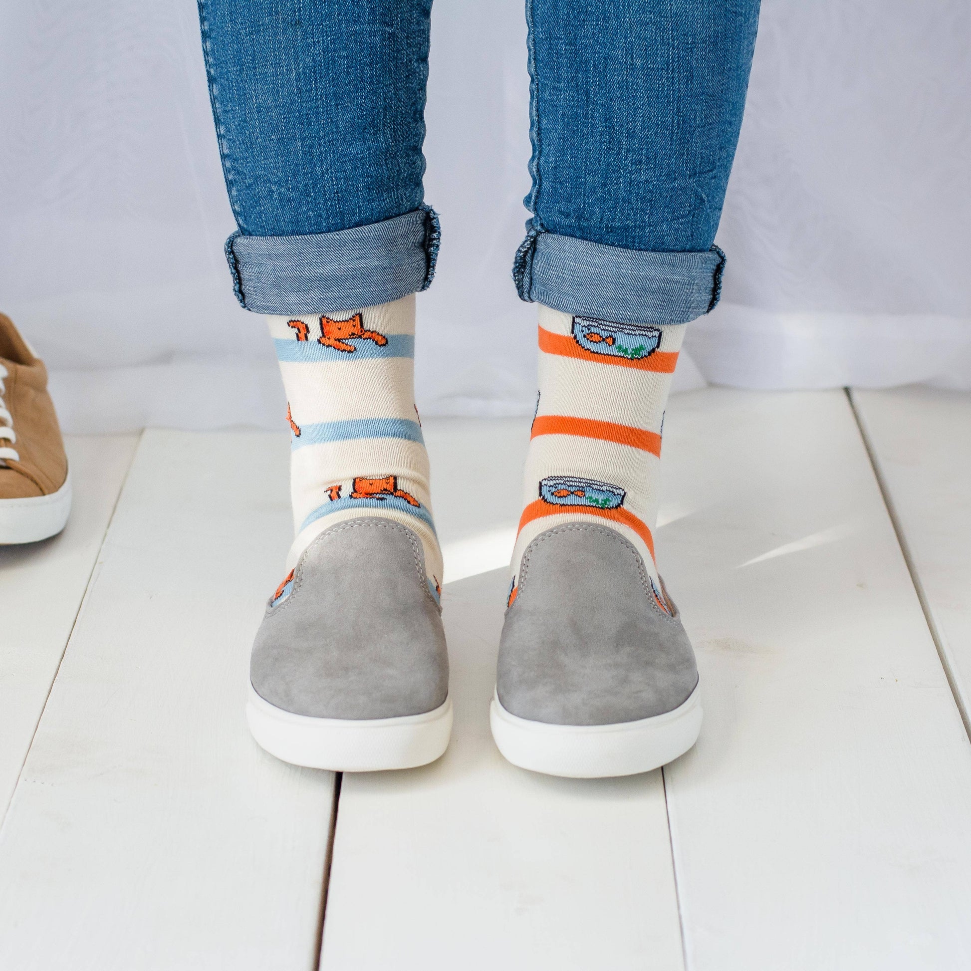 You'll want to wear these socks fur-ever. Women's Cat and Fishbowl Mismatched Socks will have you feeling radi-claw.