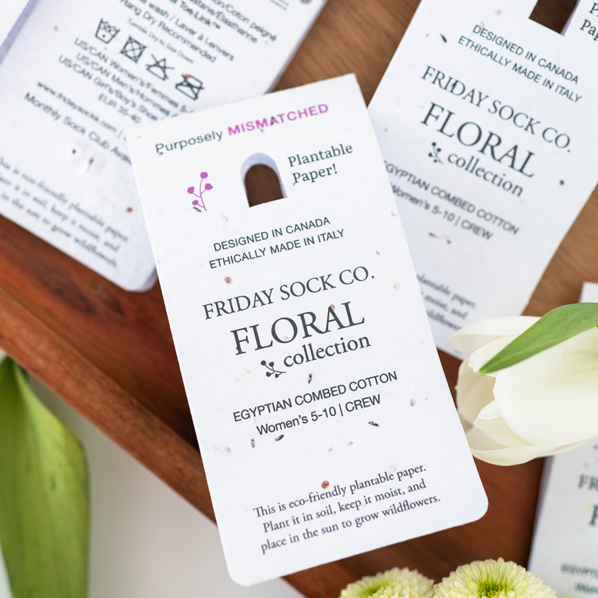 Each pair of socks from our Floral Collection comes with a plantable seed paper hang tag. Put into a pot with soil, add water and sunlight, and watch your very own wildflowers start to grow!